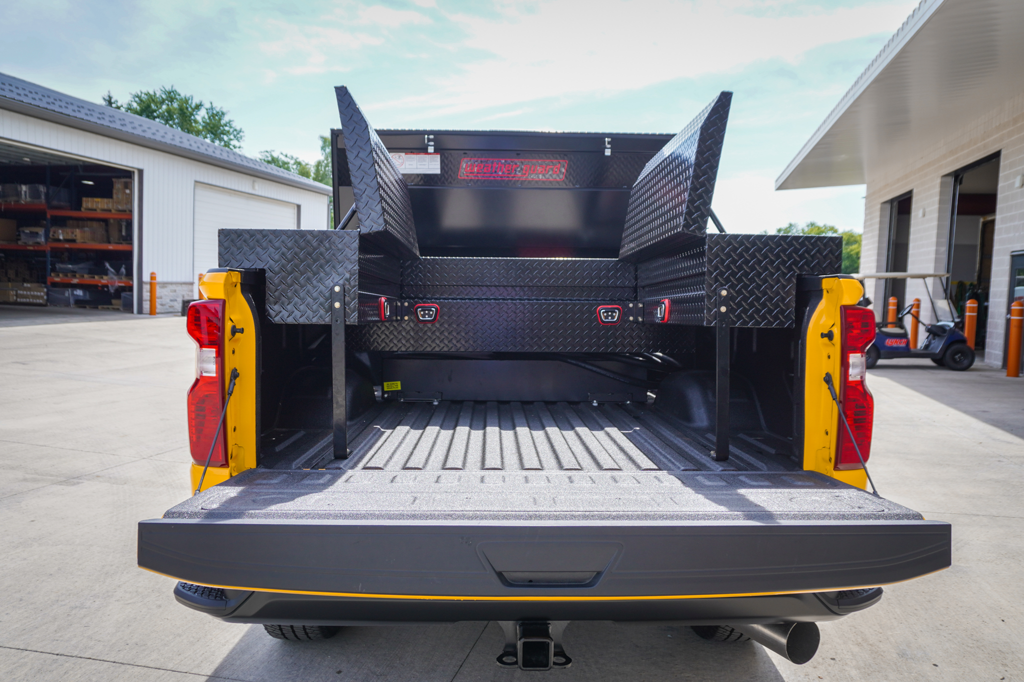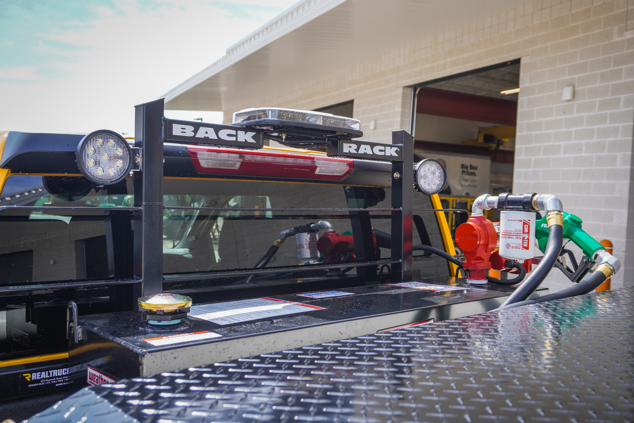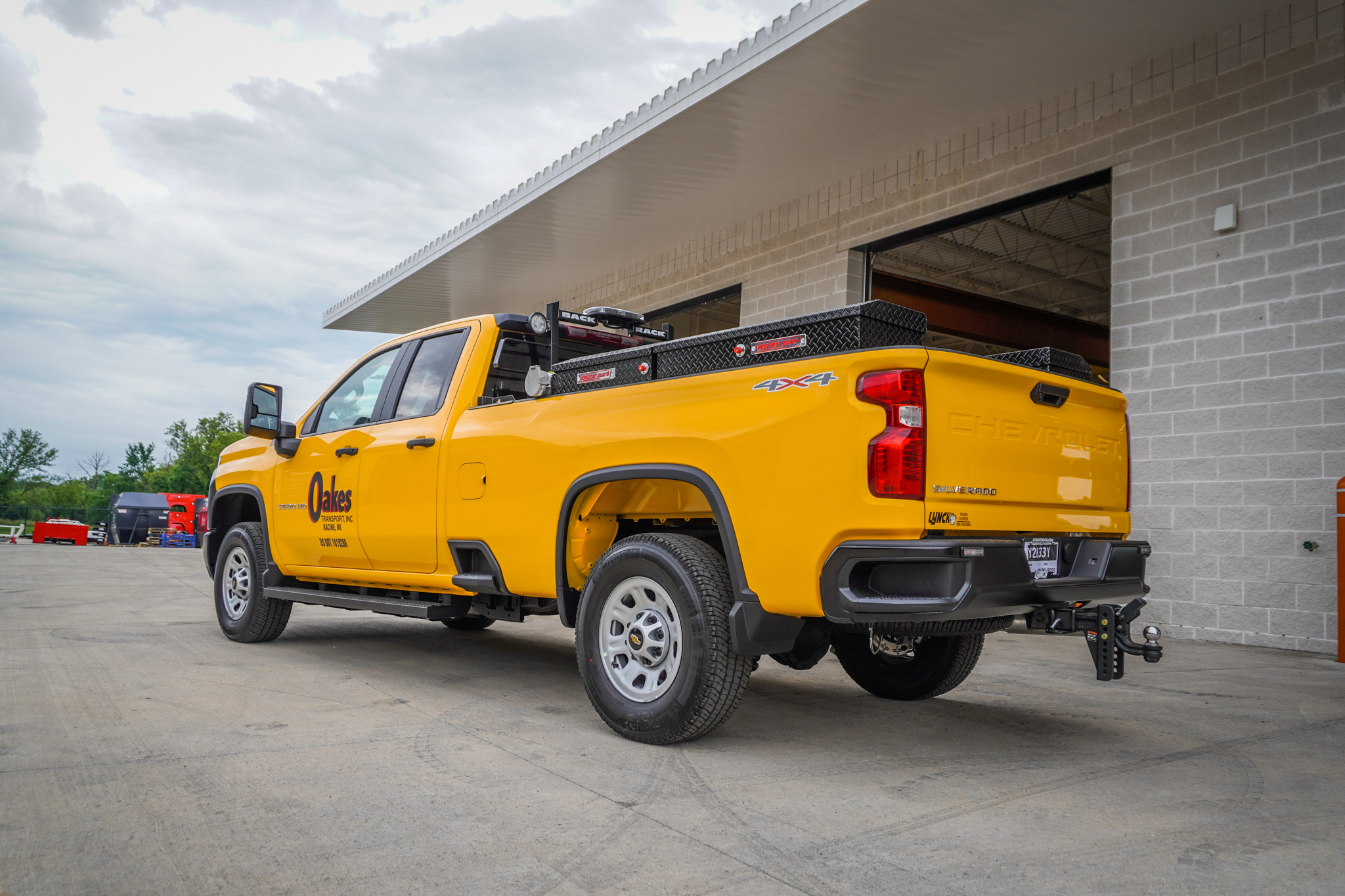 These 2025 Chevrolet Silverado 3500 WT's for AW Oakes & Son in Racine, WI feature a Weather Guard 110-gal L-shape fuel tank with Fill-Rite pump, conduit carrier, Weather Guard saddle and side boxes, Back Rack with LED work lamps, four-corner strobes, and GM assist steps and splash guards—custom-built and ready for work.